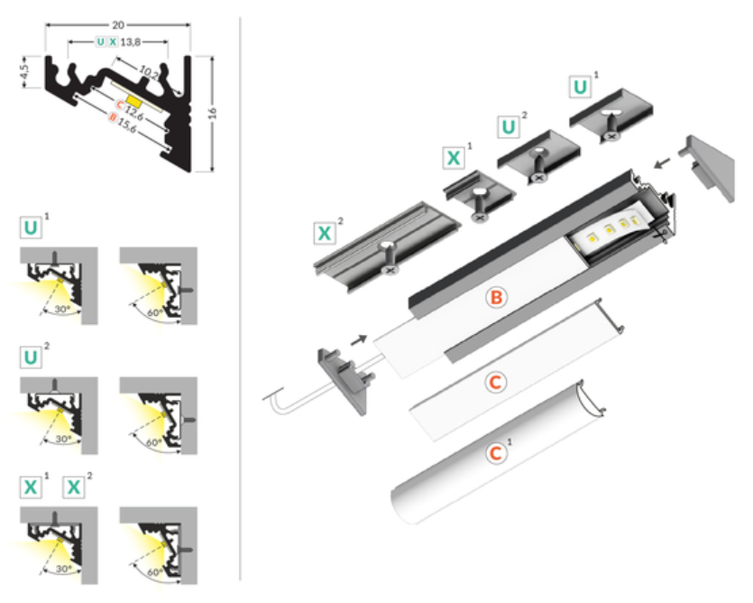 Hörn LED-profil CORNER10 BC/UX 3000 i anodiserat aluminium är en stilren och hållbar lösning för installation av LED-strip. Med en längd på 3000 mm och en maximal LED-bredd på 10 mm, ger den en effektiv och professionell belysningslösning. Ljusets riktning kan anpassas med två alternativ, 30° eller 60°, för flexibel belysning efter behov och miljö.