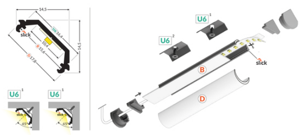 LED-profilen QUARTER10 BD/U6 4050 i anodiserat aluminium är en innovativ lösning för fullständig cirkelbelysning i kvadranter. Den är speciellt utformad för att montera LED-strips i en 45-graders vinkel, vilket ger en smidig och jämn ljusfördelning. Med en längd på 1000 mm och en maximal LED-bredd på 10 mm, är den perfekt för professionella och stilrena belysningslösningar.