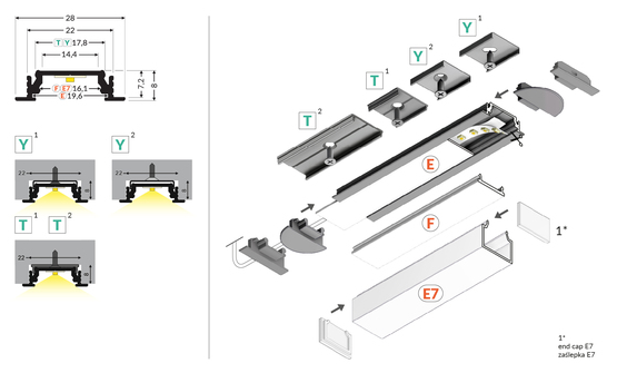 LED-profil GROOVE14 EE7F/TY är en infälld aluminiumprofil med anodiserad finish, utformad för professionella och eleganta ljusinstallationer. Med en maximal LED-bredd på 14 mm ger den en flexibel och effektiv lösning för belysningsprojekt.