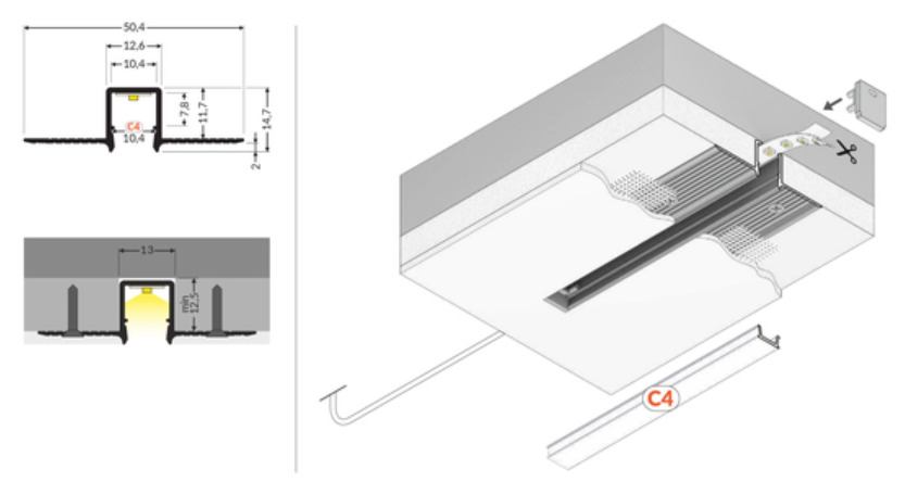 Profildesignen möjliggör infällning direkt i vägg eller tak med spacklade kanter för ett helt sömlöst och diskret resultat utan synliga övergångar. Profilen är anpassad för att passa i tjockleken på en standardgipsskiva (12,5 mm) och integreras därmed smidigt i byggnationen. En idealisk lösning för moderna miljöer där ljuskällan ska vara dold men samtidigt skapa stämningsfull och jämn belysning.