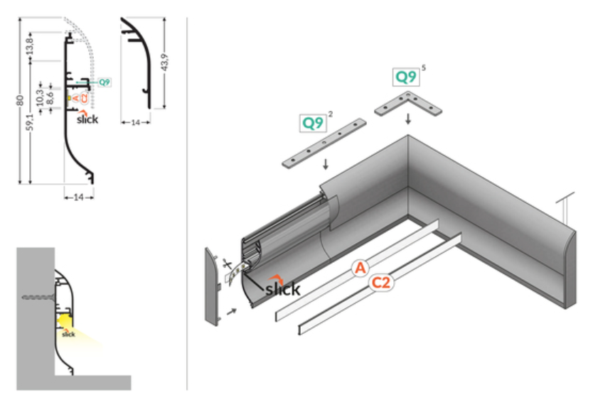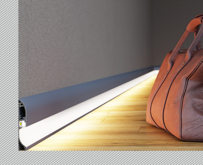 LED-profil SKIRT10 i aluminium är en kompletterande profil till SKIRT10 AC2/Q9, utformad för att ge en elegant och robust sockellist för LED-lister. Profilen är optimerad för att skapa en jämn ljuseffekt, särskilt i kombination med matt golv eller mattor. Den erbjuder en smidig installation och har ett inbyggt utrymme för att dölja kablar, vilket säkerställer en stilren och diskret belysningslösning.