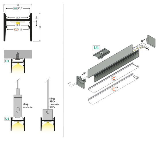LED-profil COZY12 C/U1 4050 Svart – För utanpåliggande installation av LED-lister
