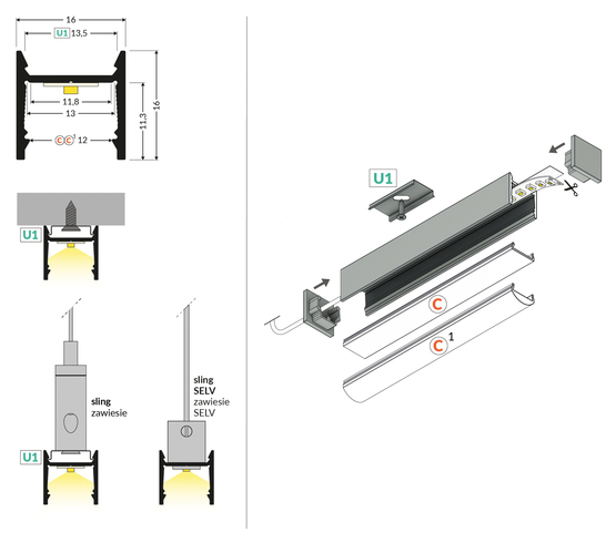LED-profil LEVEL12 C/U1 2000 i Svart är en hållbar och stilren lösning för ytmontage av LED-lister. Med en längd på 2000 mm och en maximal LED-bredd på 12 mm är denna profil perfekt för att skapa en effektiv och professionell belysningsinstallation.