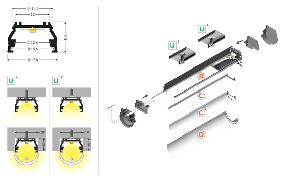 LED-profil UNI12 BCD/U är en stilren och slitstark profil i anodiserat aluminium, perfekt för linjära belysningslösningar. Med en maximal LED-bredd på 12 mm är den anpassad för en mängd olika installationer, från dekorativ till funktionell belysning.