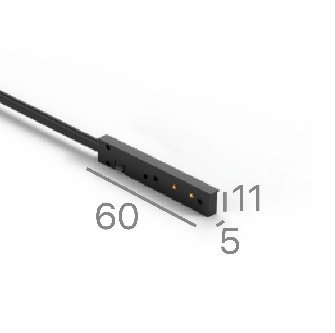 Svart strömmatningsmodul med kabel är en viktig komponent till LINE24 – 24V Micro Track för plana ytor och används för att tillföra ström till magnetskenesystemet på ett säkert och diskret sätt. Modulen möjliggör extern strömmatning via fjärrplacerad transformator och säkerställer stabil drift i hela installationen.