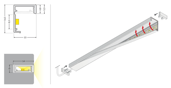 Profilerna är anpassade för installation i smala utrymmen (5×14 mm) och kan även monteras i böjda former, med en minimal böjradie på 25 cm – vilket ger stor flexibilitet vid design och montering.