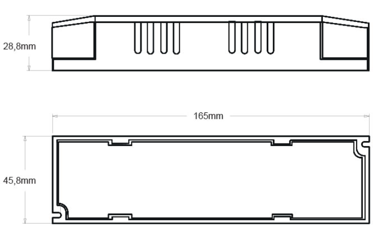 • Mått: 166 × 44 × 28 mm (ritning visar 165 × 45,8 × 28,8 mm)