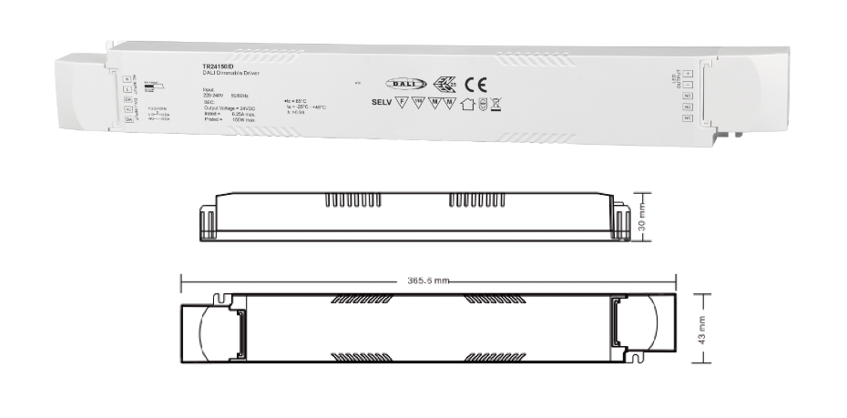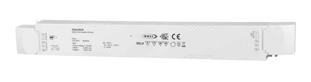TR24150/D är en DALI-dimbar strömförsörjning från LEDCO för 24V DC-system. Den är avsedd för inomhusmiljöer och har IP20, vilket gör den lämplig för installation i torra utrymmen. Enheten är byggd i plast, är anpassad för vägg-/takmontage och är kompatibel med 24V monokroma LED-strips för styrning via DALI, samt dimring via push.