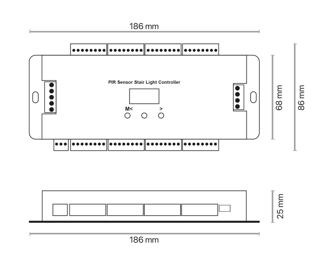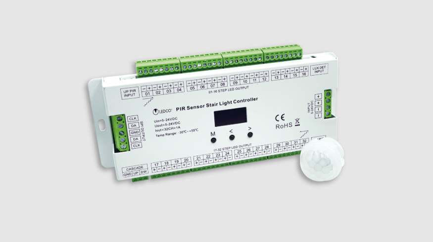 CTS100 är en avancerad styrenhet för automatiserad och anpassningsbar belysning av trappor, korridorer, gångvägar och liknande miljöer. Enheten arbetar med två medföljande IR/PIR-detektorer som känner av rörelse och tänder belysningen stegvis i rörelsens riktning. Du kan ställa in antal steg, ljusintensitet och hastighet för att skapa både en säker och scenografisk ljuseffekt. Enkel installation och tydlig konfigurering via OLED-display och tre knappar gör CTS100 till ett professionellt val för smarta belysningslösningar. Kompatibel med Strip Runner samt LED-strips i 5–24V DC-system (vanligtvis 24V).
